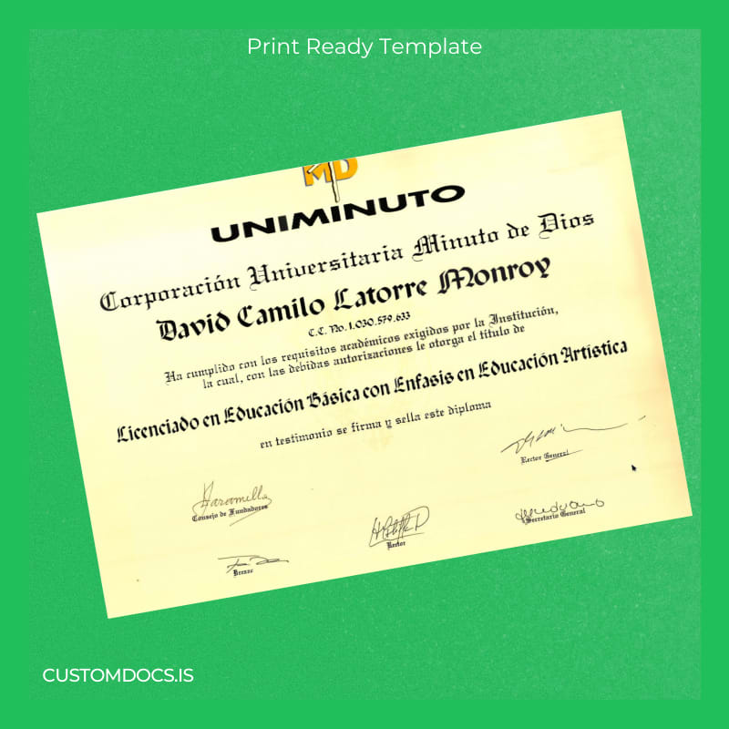 The Colombia Corporación Universitaria Minuto de Dios Licentiate in Basic Education with Emphasis in Artistic Education Template – Word & PDF offers a seamless way to obtain a fully customizable and high-quality digital diploma. Designed for educators, administrators, and professionals requiring a quick and reliable replacement, this template is your go-to option for instant use.