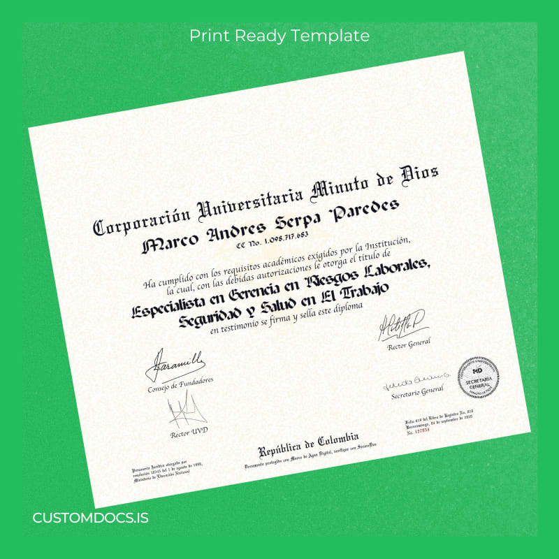 Losing your official diploma or urgently needing a replacement can cause significant stress and disrupt your professional advancement. Bureaucratic delays, lengthy reissuance processes, and the potential of missed opportunities due to unverified credentials create an overwhelming experience. Act now to avoid these pitfalls with the Colombia Corporación Universitaria Minuto de Dios Specialist in Management of Labor Risks, Safety, and Health at Work Template – Word & PDF.