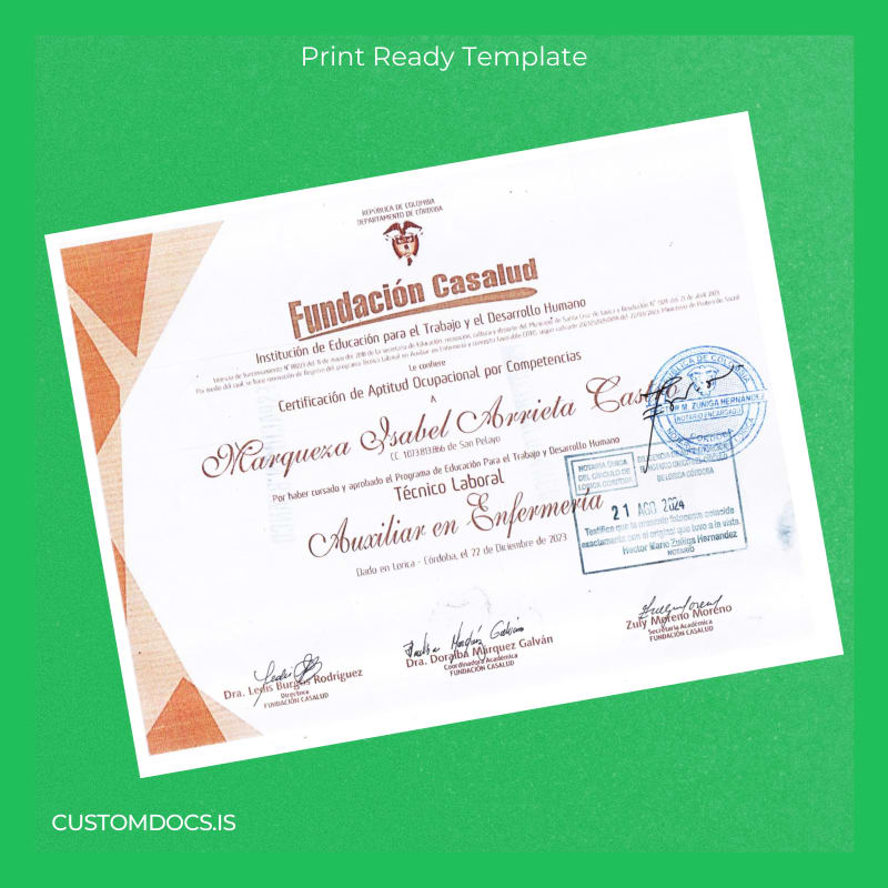 Losing an important document like your nursing auxiliary diploma can cause significant stress and disrupt your career progress. Navigating complex bureaucratic processes to request replacements often leads to long waits and missed opportunities. Avoid these hassles with the Colombia Fundación Casalud Técnico Laboral Auxiliary in Nursing Template – Word & PDF.