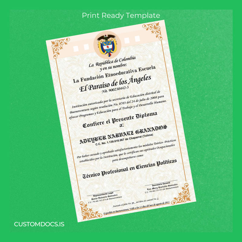 The Colombia Fundación Etnoeducativa Escuela El Paraíso de los Ángeles Técnico Profesional en Ciencias Políticas Template – Word & PDF provides an instant, easily customizable diploma template designed to save time and alleviate documentation anxiety. Whether you require a swift replacement for a lost diploma or need a pristine certificate design for presentation purposes, this template ensures a seamless experience.