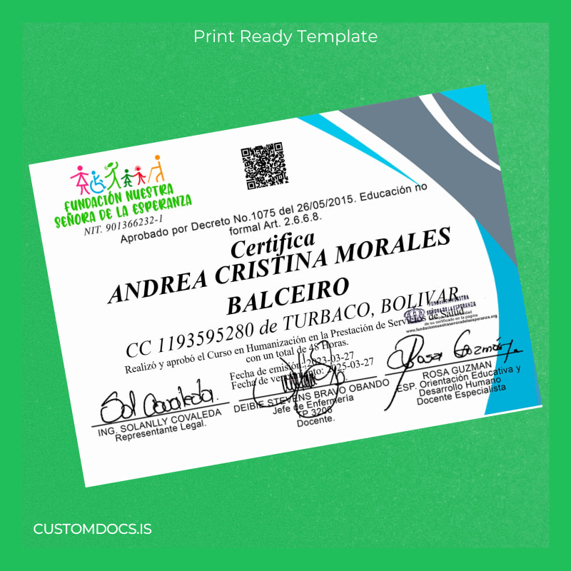 Download Colombia Fundación Nuestra Señora de la Esperanza Course Certificate in Humanization Template – Word & PDF (Instant Access)