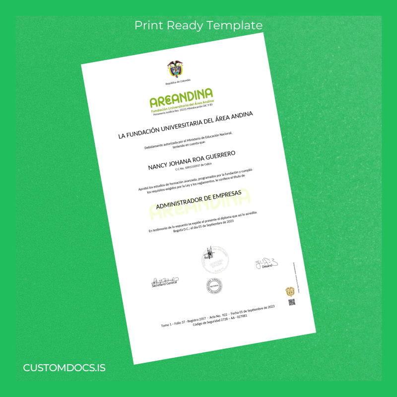Instant Editable Diploma Template for Colombia Fundación Universitaria del Área Andina