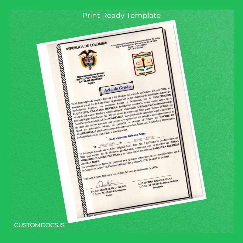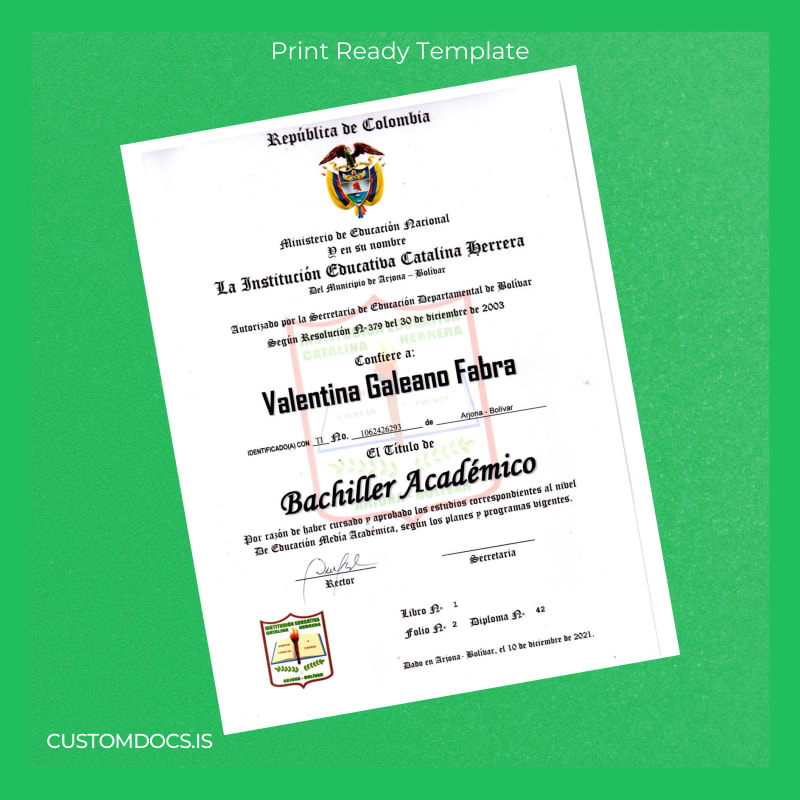 The Colombia Institución Educativa Catalina Herrera High School Diploma Template – Word & PDF offers an editable and customizable degree template ready for instant download and immediate use. It provides a professional, blank diploma form designed to closely resemble the original, making it suitable for replacement and novelty uses alike. This digital diploma download is perfect for professionals in urgent need of a workaround, educators, or creative individuals seeking a high-quality, customizable diploma design.