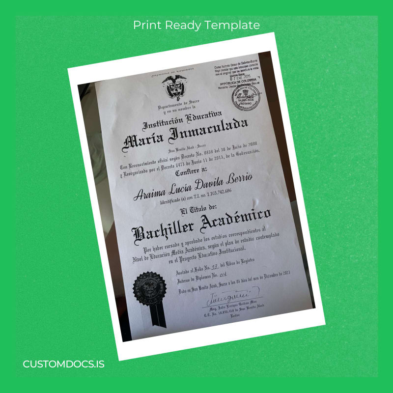 The Colombia Institution Educativa María Inmaculada High School Diploma Template – Word & PDF is the perfect solution to quickly create a customizable, professional diploma. Designed with precision and ease of use, this editable template allows you to regain control immediately.