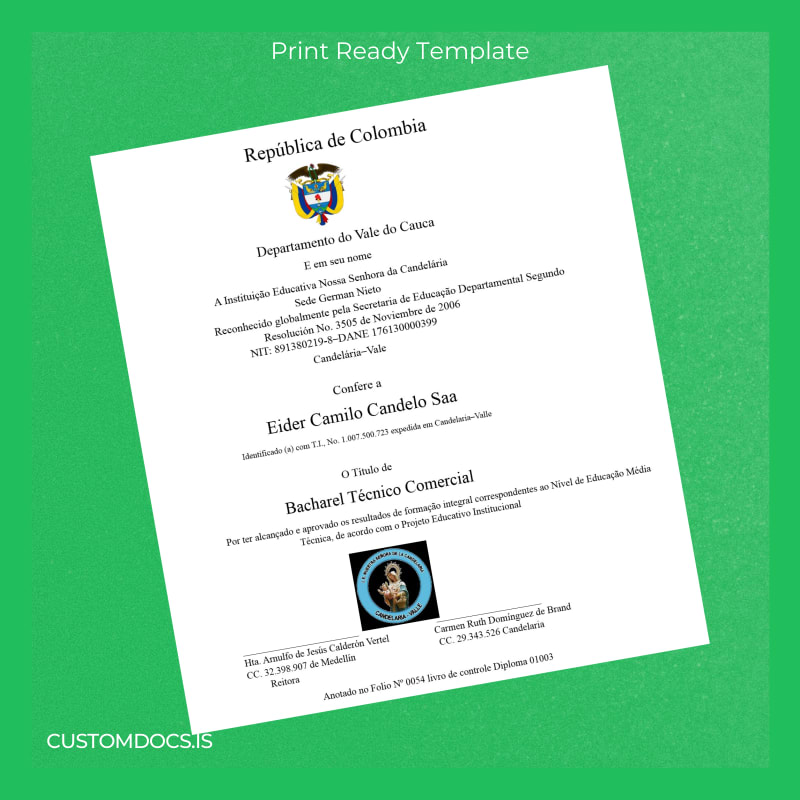 This editable diploma template offers a swift, user-friendly resolution for those needing an authentic-looking diploma replacement. Tailored specifically for the Colombia Institution Educativa Nuestra Señora de Candelaría Bachelor of Commercial Technician degree, this digital download is fully customizable and print-ready. Designed for easy editing, it enables professionals worldwide to personalize their certificates swiftly in Word or PDF formats.