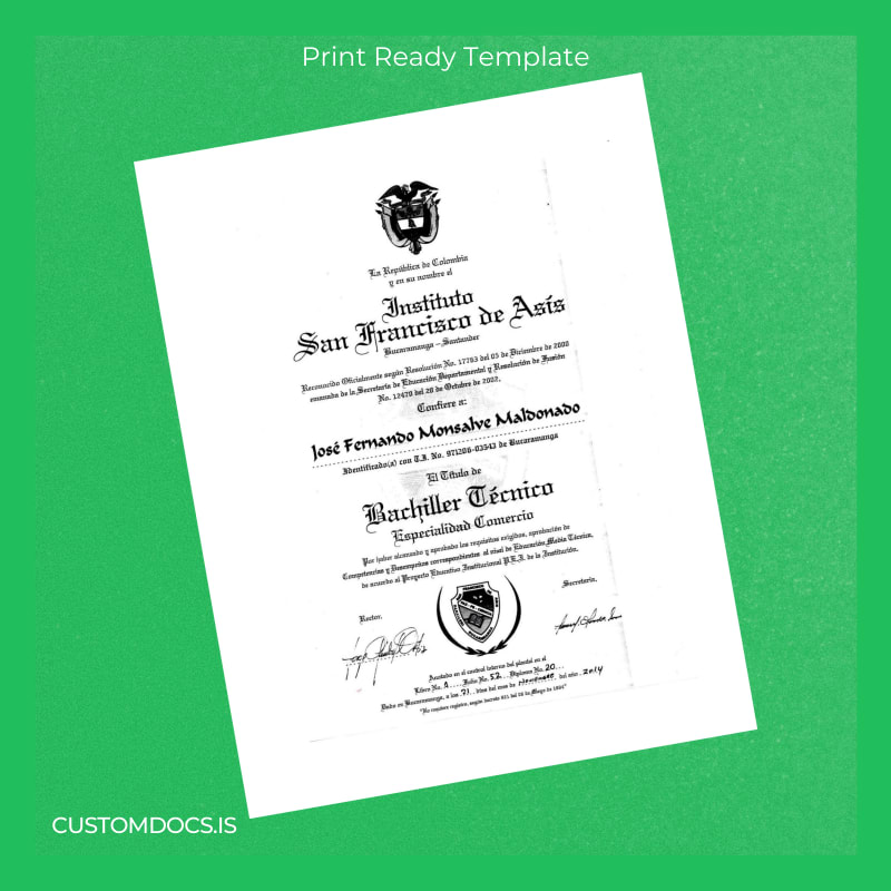 Colombia Instituto San Francisco de Asís Technical High School Diploma Template – Word & PDF