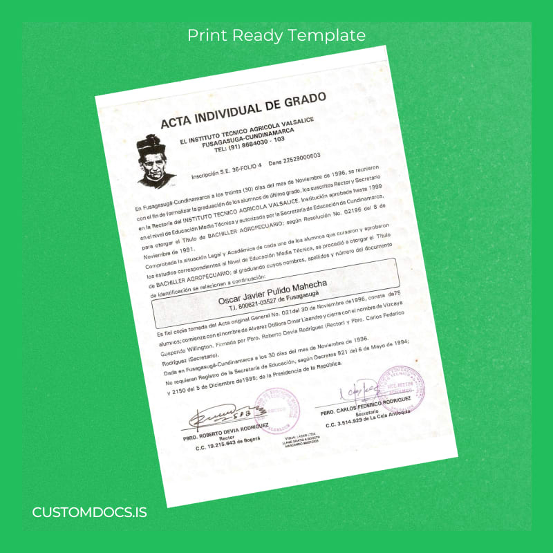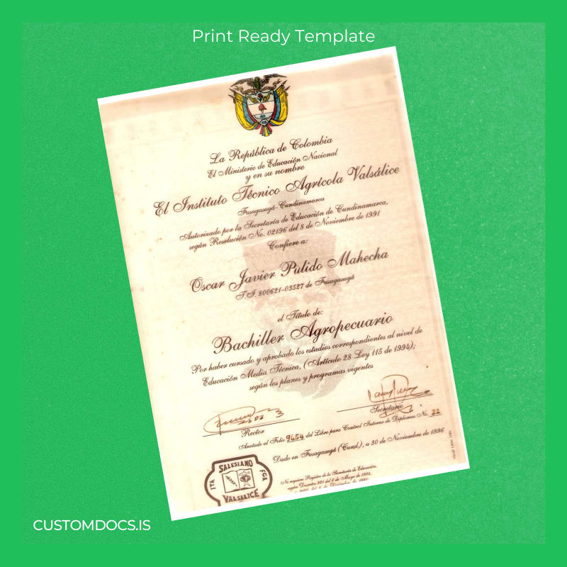 Download Colombia Instituto Tecnico Agrícola Valsálice High School Diploma Template – Instant Digital File 2 Page