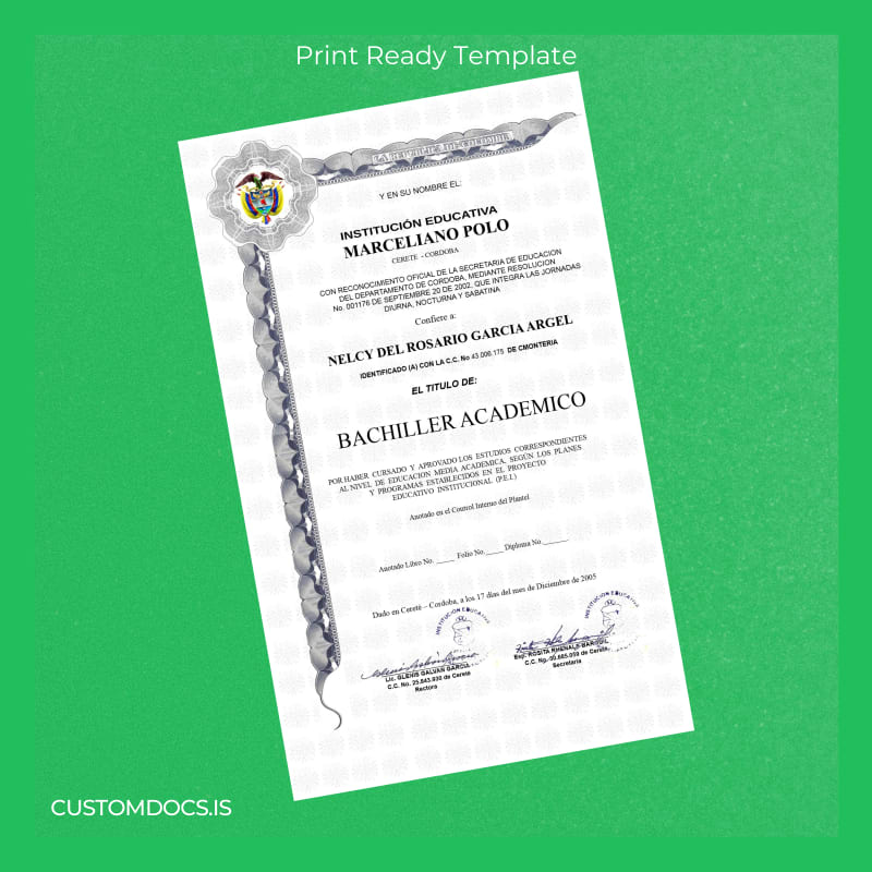 The Colombia Marceliano Polo Academic Bachelor Diploma Template – Word & PDF offers a fast and reliable custom diploma certificate that you can edit and print immediately. Designed for professionals who need an elegant and accurate replacement diploma, this template is fully customizable to your specific details.