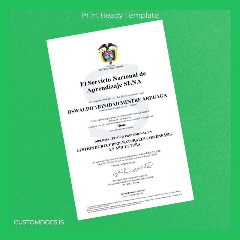 Our Customizable Degree Template category includes this exclusive Colombia SENA Technical Diploma in Natural Resource Management with Emphasis in Beekeeping Template available in Word and PDF formats. It offers: