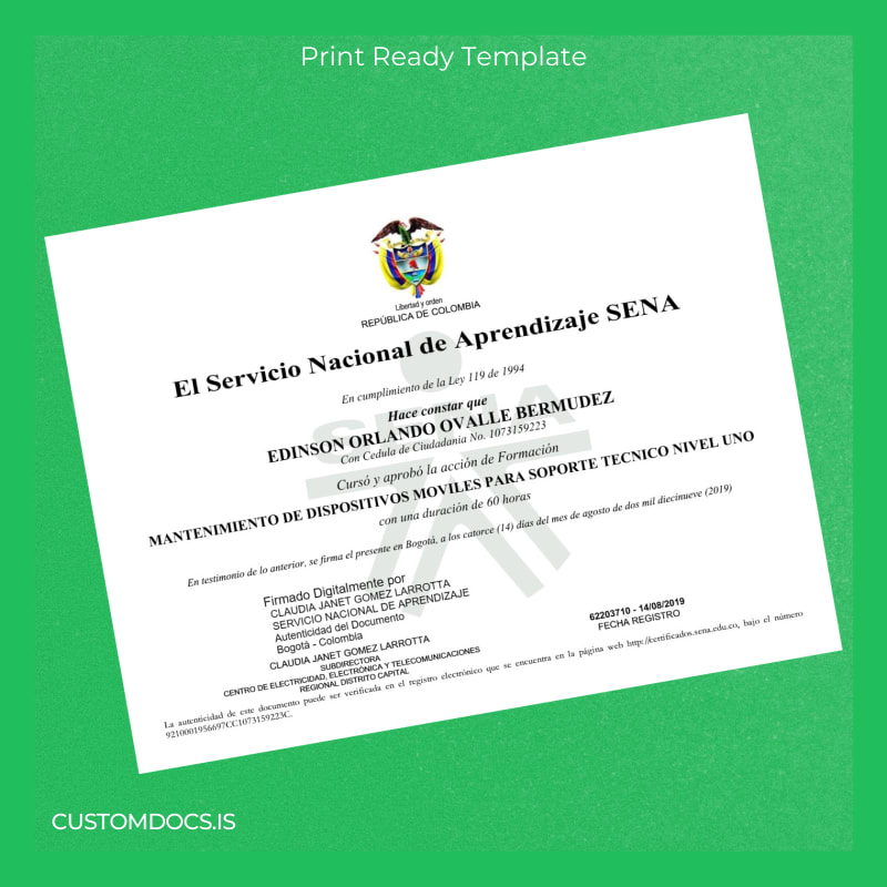 The Colombia Servicio Nacional de Aprendizaje SENA Certificate in Mobile Devices Maintenance Level One Template – Word & PDF offers an instant and customizable digital diploma download designed specifically for professionals who value accuracy and speed. This editable diploma template allows you to create a professional, blank diploma form to replace your original certificate effortlessly.