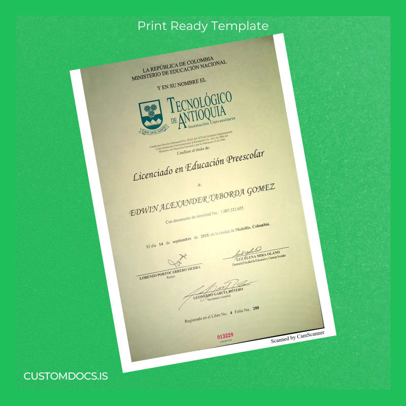 The Customizable Degree Template Colombia Tecnológico de Antioquia Licentiate in Preschool Education Diploma Template – Word & PDF lets you instantly download, edit, and print a high-quality, accurate replica of your diploma. Designed specifically for graduates seeking a swift and elegant diploma substitute, this template merges professional design with usability, gearing you for prompt submission wherever required.