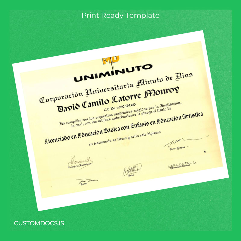 The Colombia Uniminuto Bachelor of Education with Emphasis in Artistic Education Template – Word & PDF offers an immediate, fully customizable, and print-ready diploma format. Crafted for educators and creatives, this template provides an efficient alternative to traditional diploma reissuance.