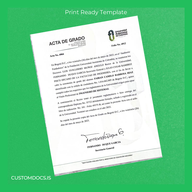 - Tailored specifically for Colombia Universidad Autónoma de Colombia Bachelor of Systems Engineering diploma recreation.
