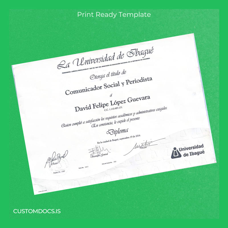 This editable diploma template eliminates the pain of paperwork and delivery delays, empowering graduates, educators, and creatives to access a premium-quality digital diploma fast. Whether you need a replacement diploma or a polished, customizable certificate, this Word & PDF template provides a reliable and legal-looking solution tailored for Colombia Universidad de Ibagué graduates specializing in social communication and journalism.