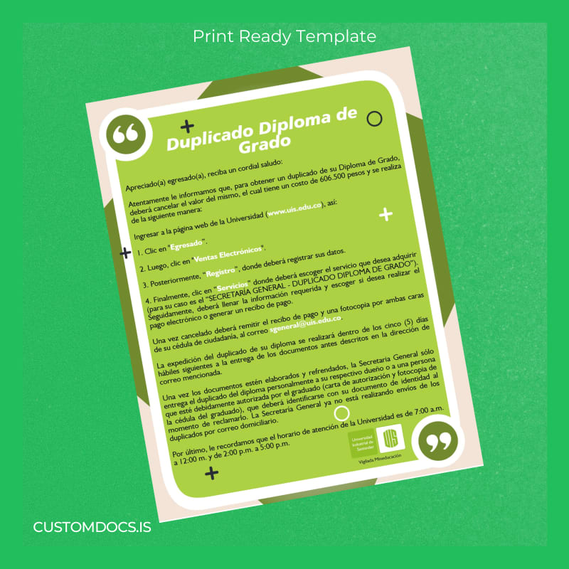Misplacing your essential academic documents can disrupt your career plans or educational pursuits. The bureaucratic hassle of requesting replacements from universities is often a long, stressful process that can delay your progress. Avoid the pitfalls of lost time and missed opportunities with the Colombia Universidad Industrial de Santander Duplicate Diploma Template – Word & PDF, designed for immediate download, customization, and print readiness.
