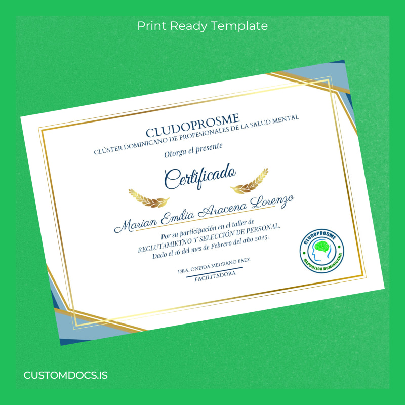 Download Dominican Republic CLUSTER OF DOMINICAN PROFESSIONALS IN MENTAL HEALTH Certificate Template – Word & PDF – Instant Digital File