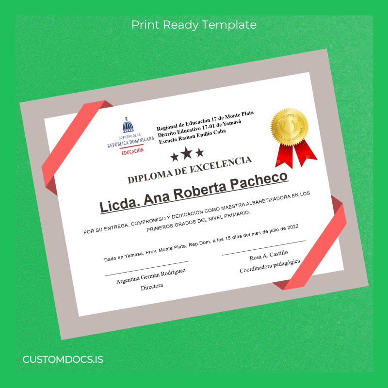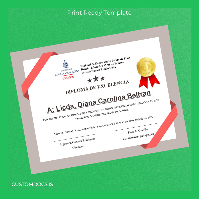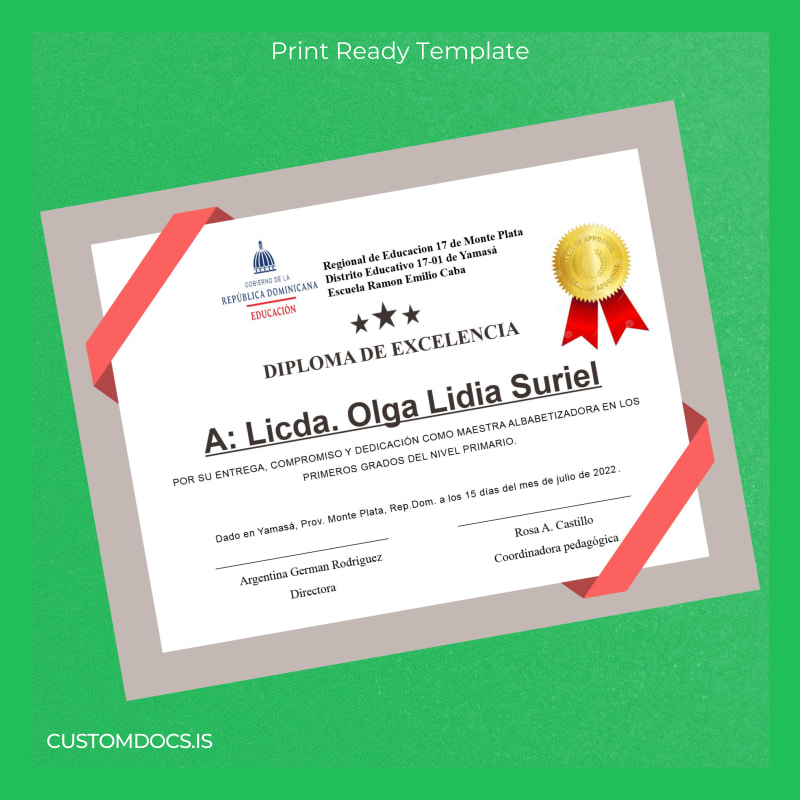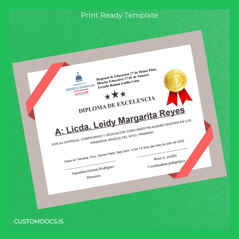 Losing an important academic document or requiring a quick replacement can cause significant stress and delay your professional progress. The bureaucratic processes involved in obtaining official diploma copies often lead to prolonged waiting times, lost opportunities, or missed deadlines. For professionals in need of a fast and hassle-free solution, the Dominican Republic Ramon Emilio Caba School Excellence Diploma Template – Word & PDF is designed to provide immediate relief.