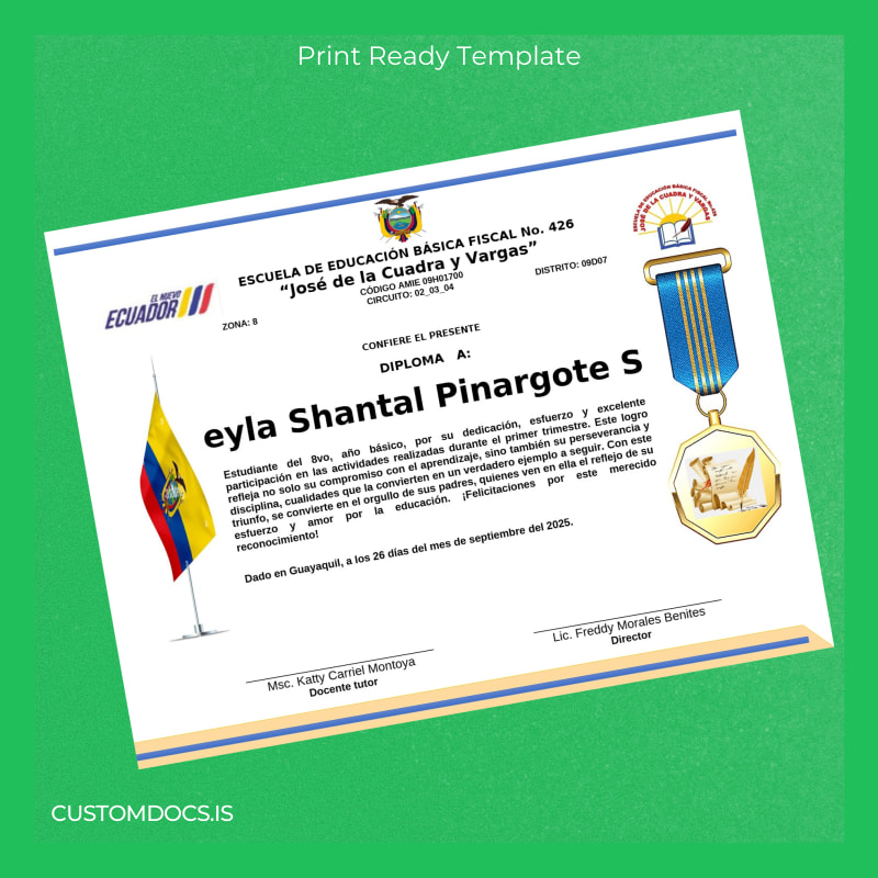 Instant Editable Diploma Template for Ecuador Escuela de Educación Básica Fiscal No. 426
