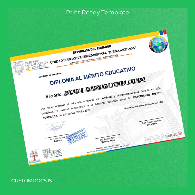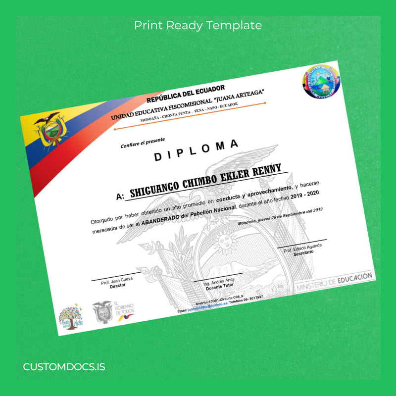 Instant Editable Diploma Template for Ecuador Unidad Educativa Fiscomisional Juana Arteaga
