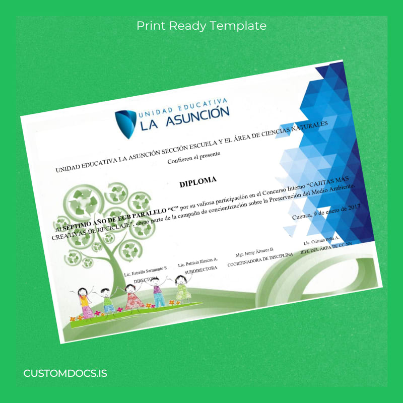 Download Ecuador Unidad Educativa La Asunción Diploma for Participation in Recycling Contest EGB 7C Template – Word & PDF – Instant Digital File