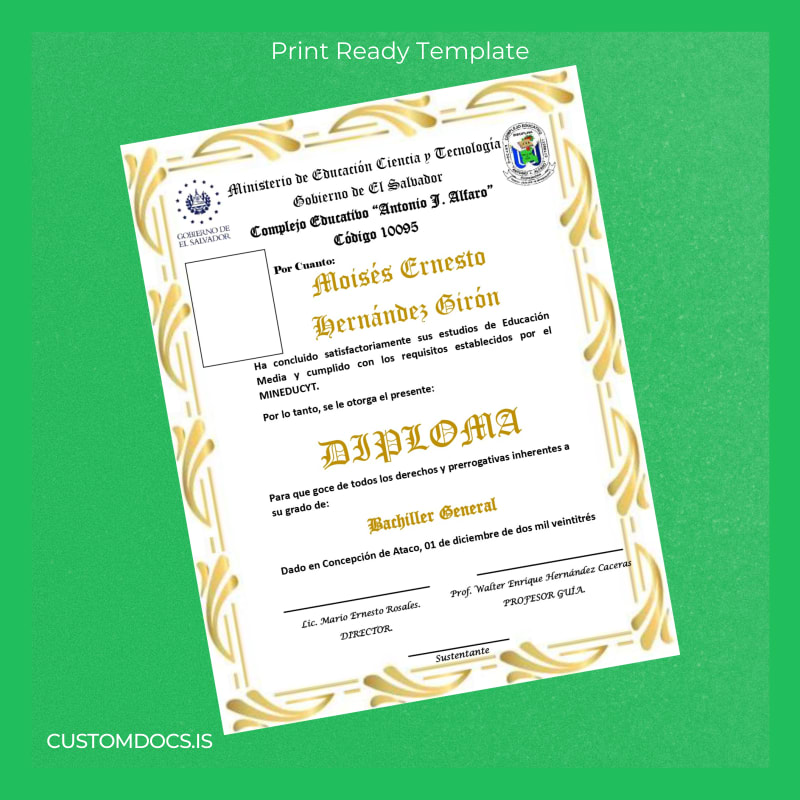 El Salvador Complejo Educativo Antonio J Alfaro High School Diploma Template – Word & PDF: Your Quick Digital Solution