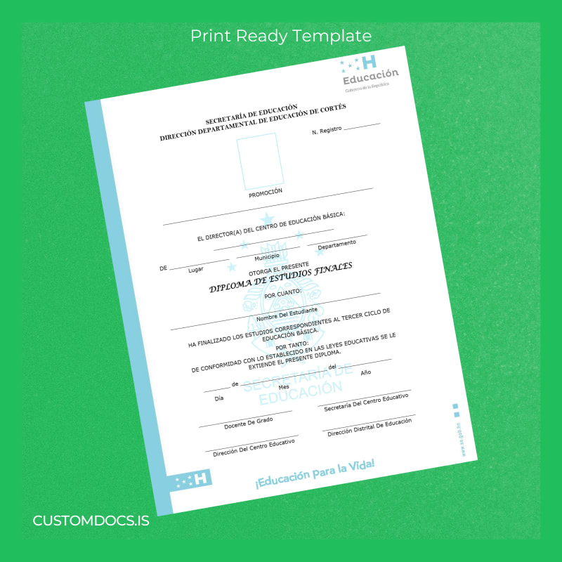 Introducing the El Salvador Diploma de 9th Grade Certificate Template – Word & PDF, a fully editable and customizable certificate designed to help you prepare a professional replacement with ease. This digital diploma download offers you an immediate, print-ready document that closely mimics official styles, helping you avoid extended disruptions. Whether you require a blank diploma form for a quick reissue or a novelty diploma design for presentations, this template adapts seamlessly to your needs.