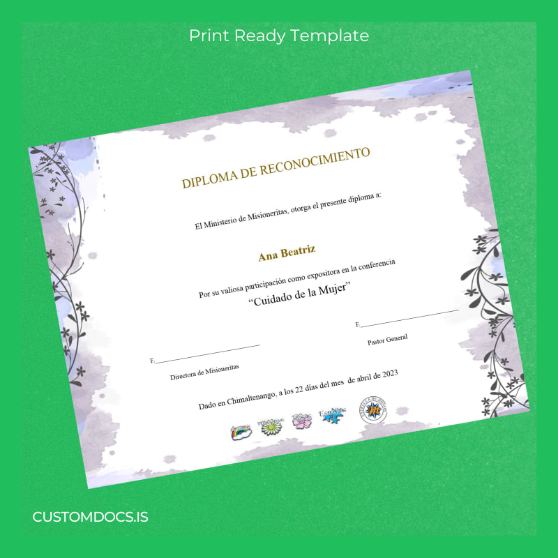 Editable and Professional Guatemala Ministerio de Misioneritas Recognition Diploma Template