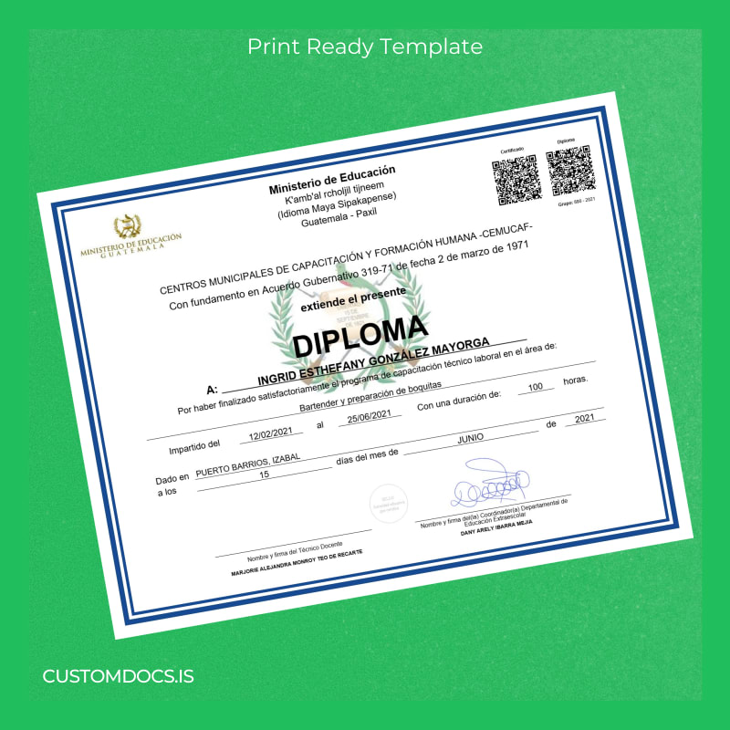 Get the editable Guatemala Ministry of Education Bartending Training Diploma Template – Word & PDF for quick, customizable, and professional digital replacement.