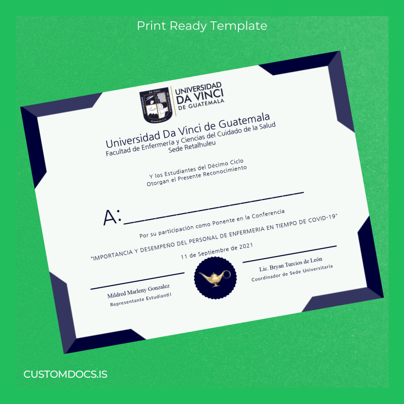 This customizable degree template for the Guatemala Universidad Da Vinci diploma allows you to personalize all vital details quickly and efficiently using Word and PDF formats. Designed for ease of use, this template ensures that you retain a high level of professionalism and authenticity in your documents.