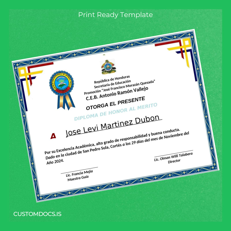 Losing your diploma or urgently needing a certified replacement can cause unnecessary stress and delays. Without a fast and reliable solution, you may face bureaucratic obstacles, long waiting periods, and the risk of missing professional or educational deadlines. This is where the Honduras C.E.B. Antonio Ramón Vallejo Honorary Diploma Template – Word & PDF steps in as your indispensable resource.
