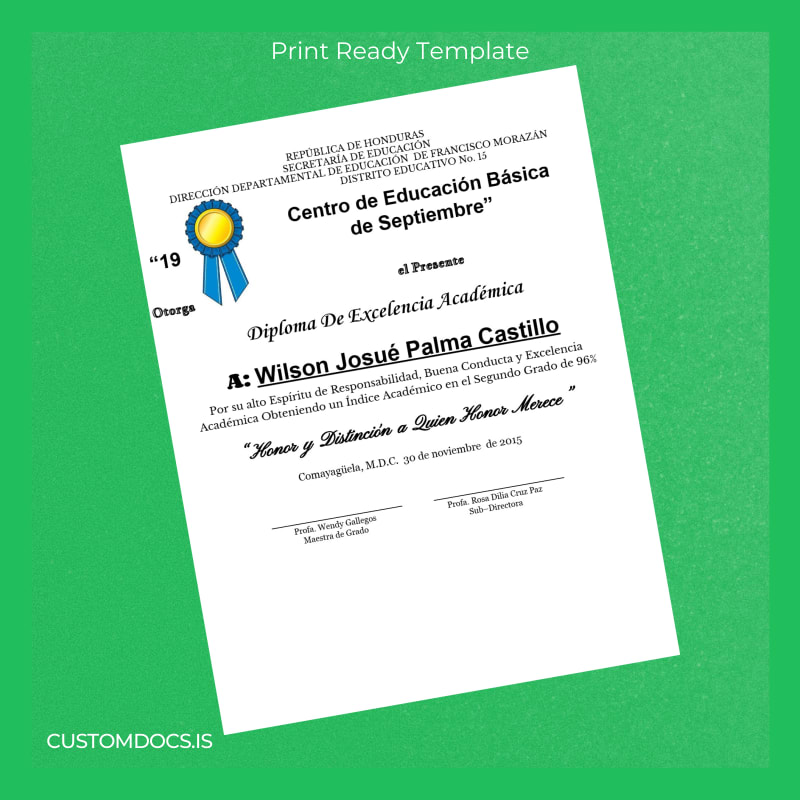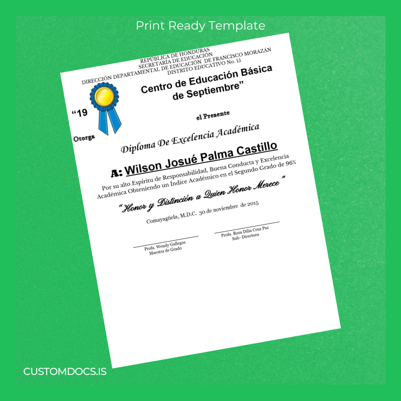 Download Honduras Centro de Educación Básica de Septiembre Academic Excellence Diploma Template – Word & PDF – Instant Digital File 2 Page