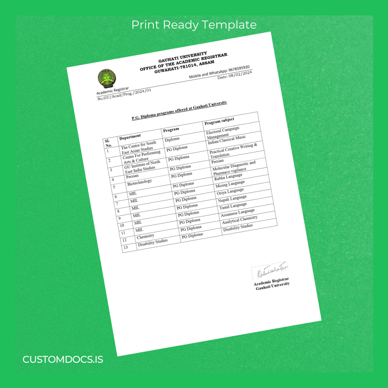Download India Gauhati University PG Diploma Template – Word & PDF (Instant Access)