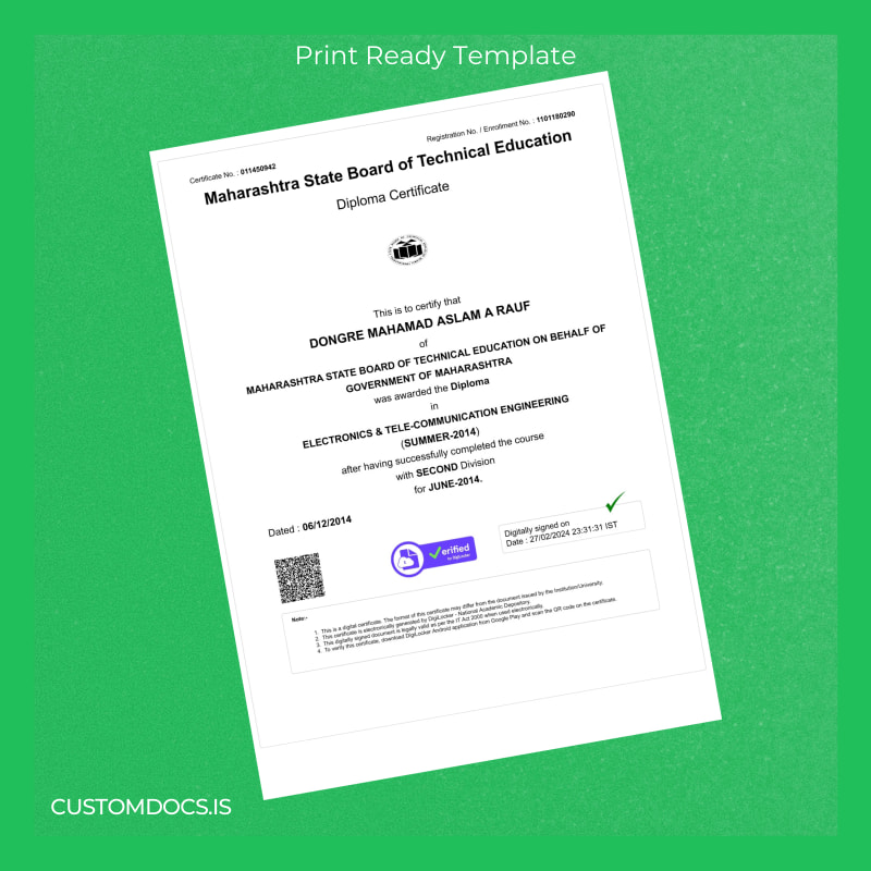 Don’t let lost or damaged certificates disrupt your career. Our customizable degree template offers a hassle-free way to regain a professional and authentic-looking diploma without the wait or administrative hurdles. Designed specifically for Electronic and Tele-Communication Engineering diplomas under the Maharashtra State Board of Technical Education, this digital template is precisely what you need to restore your credentials swiftly and professionally.