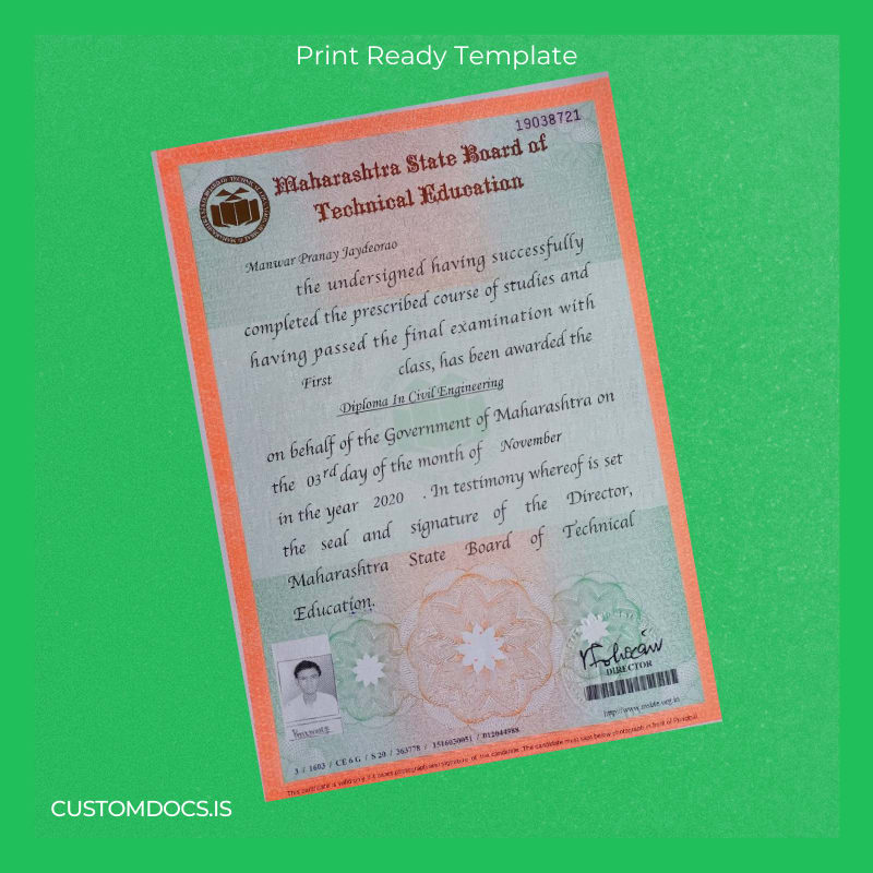 This comprehensive template is designed to replicate the official diploma format accurately while offering seamless editing in both Word and PDF formats. Tailored specifically for Maharashtra State Board of Technical Education diplomas in Civil Engineering, it allows you to update names, dates, and other critical details with ease.