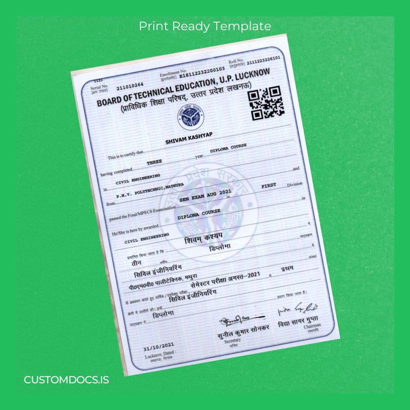 This professionally designed template provides a seamless experience for graduates and professionals alike. Crafted specifically to meet the requirements of India P.M.V. Polytechnic’s Civil Engineering diplomas, it features fully editable text fields enabling you to personalize essential details such as name, date, and certificate number easily within Microsoft Word or PDF editors.