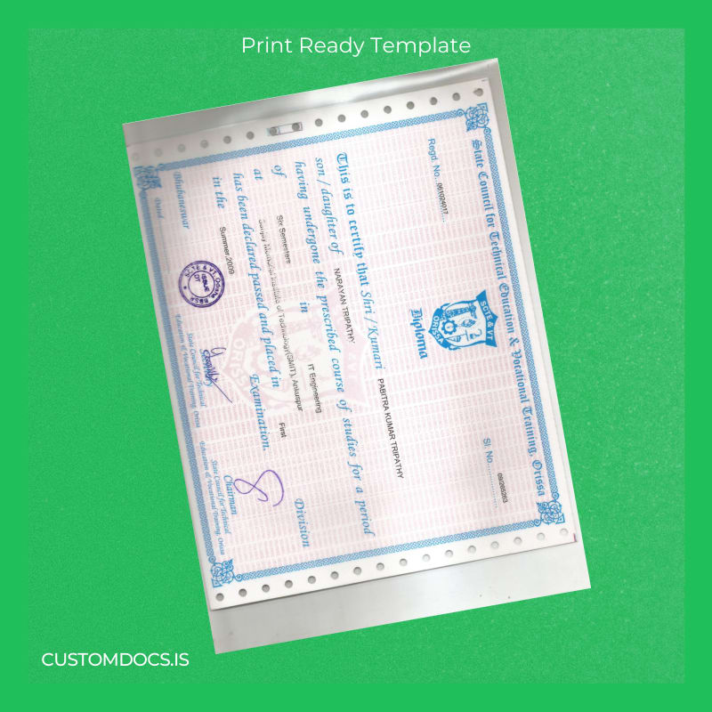 The India State Council for Technical Education Diploma in IT Engineering Template – Word & PDF offers an immediate, editable, and printable template designed specifically to meet your urgent needs. This customizable degree template ensures you have a high-quality, authentic-looking diploma ready when you need it the most. Users benefit from fully editable text and layouts enabling personalization, so every detail matches your exact information seamlessly.