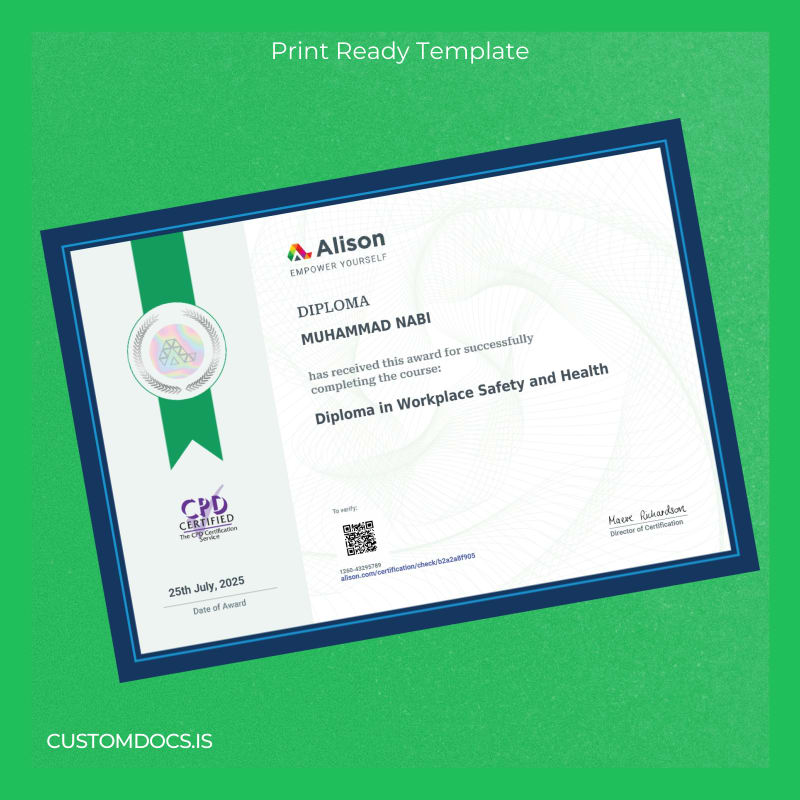 The Ireland Alison Diploma in Workplace Safety and Health Template – Word & PDF offers a quick and efficient way to resolve this issue. This editable and customizable degree template allows professionals to create a high-quality replacement diploma instantly, without the usual hassle.