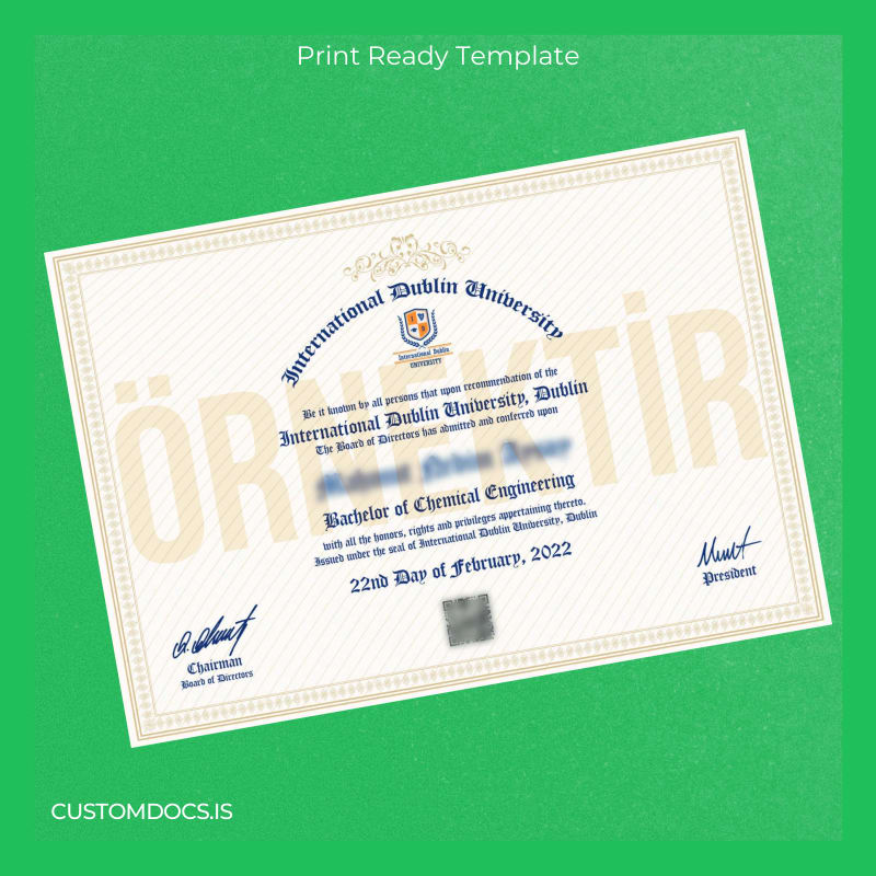 Our customizable degree template for the Ireland International Dublin University Bachelor of Chemical Engineering offers a seamless, editable, and high-quality solution ready to print. Designed for professionals who require a fast, trustworthy replacement, this template simplifies the traditionally frustrating process of document recovery by providing an easy-to-use Word and PDF format.