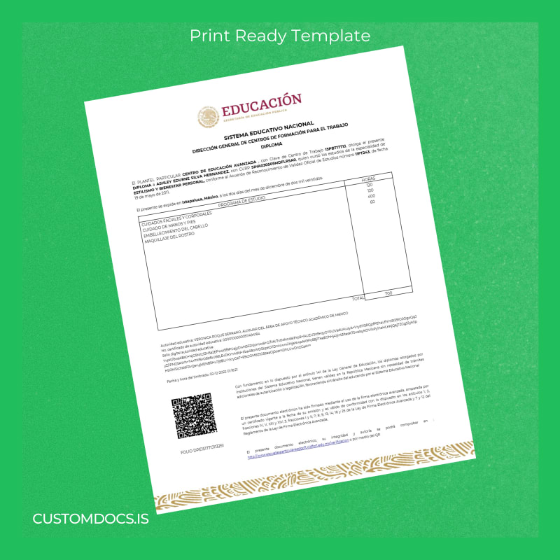 Download Mexico Centro de Educación Avanzada Diploma in Styling and Personal Well-Being Template – Word & PDF – Instant Digital File
