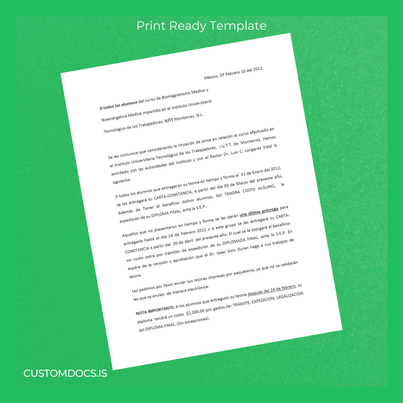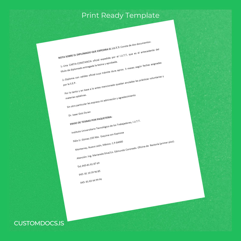 Get peace of mind with a reliable, easily customizable document format that fits your personal or institutional needs. Download the Mexico Instituto Universitario Tecnológico de los Trabajadores High School Diploma Template and regain control over your academic documentation today.