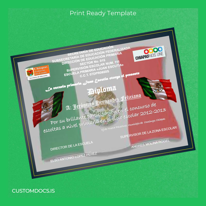 Download Mexico Juan Escutia Primary School Diploma in Recognition Template – Word & PDF – Instant Digital File