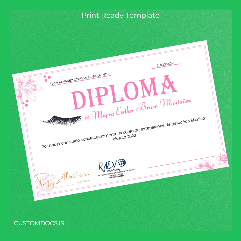 Download Mexico RAÉVÓ Academy Diploma in Eyelash Extensions Classic Technique Template – Instant Digital File 2 Page
