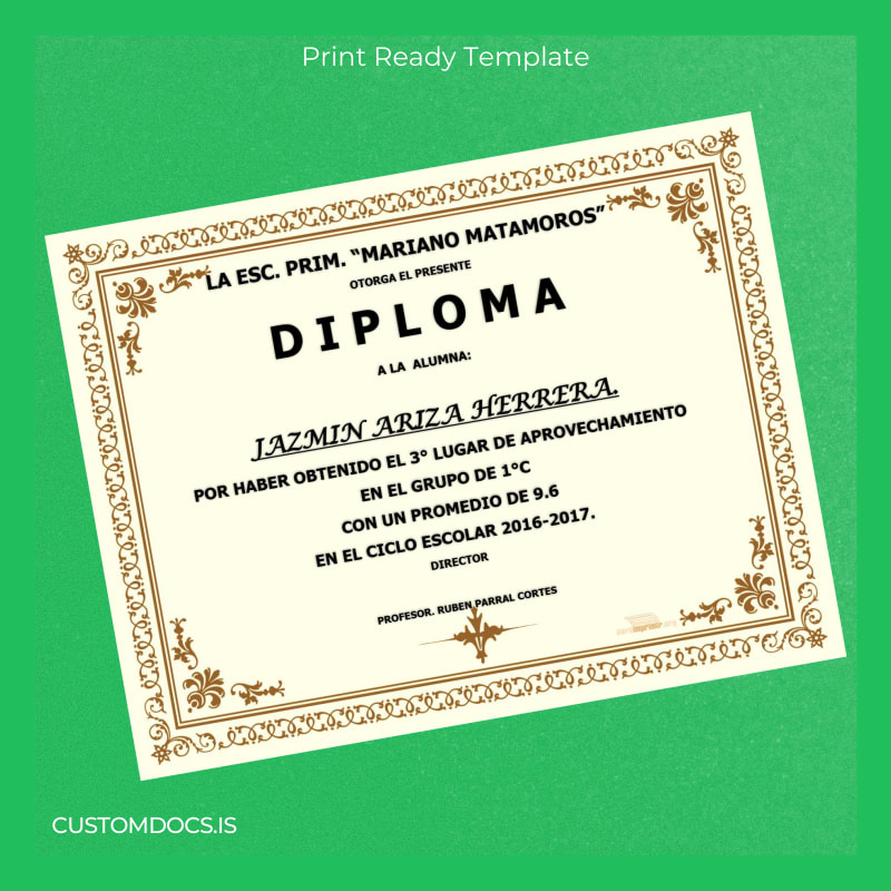 Download Mexico School _Mariano Matamoros_ Diploma Certificate Template – Word & PDF – Instant Digital File