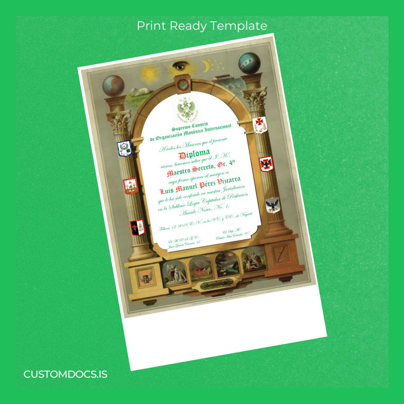 Our customizable degree template offers an immediate, editable, and professional-quality solution. Designed specifically for Master Secret Degree 4 certificates of the Mexico Supreme Council, this Word and PDF template can be personalized instantly to meet your exact requirements, allowing you to regain your documentation without delay.