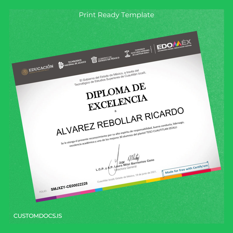 Mexico Tecnológico de Estudios Superiores de Cuautitlán Izcalli Excellence Diploma Template – Word & PDF