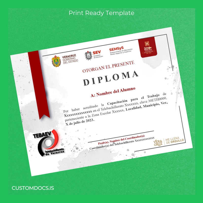 Instant Editable Diploma Template for Mexico Telebachillerato de Veracruz