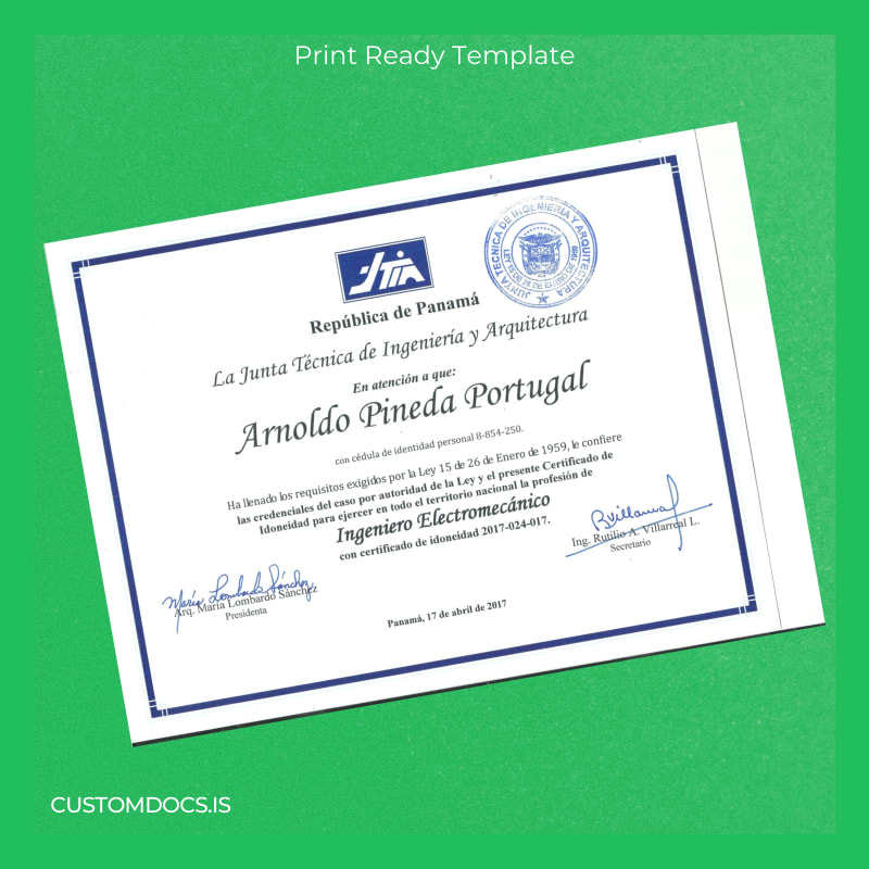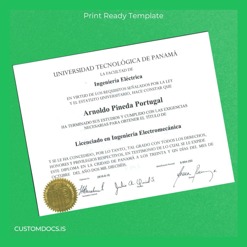 The Panama University Bachelor of Science in Electromechanical Engineering Template – Word & PDF is designed to provide both convenience and professional quality. This editable diploma template supports fast editing, allowing you to personalize your details quickly and efficiently. Available in high-resolution Word and PDF formats, this digital diploma download ensures that your certificate looks authentic and is print-ready for any official or personal requirement.