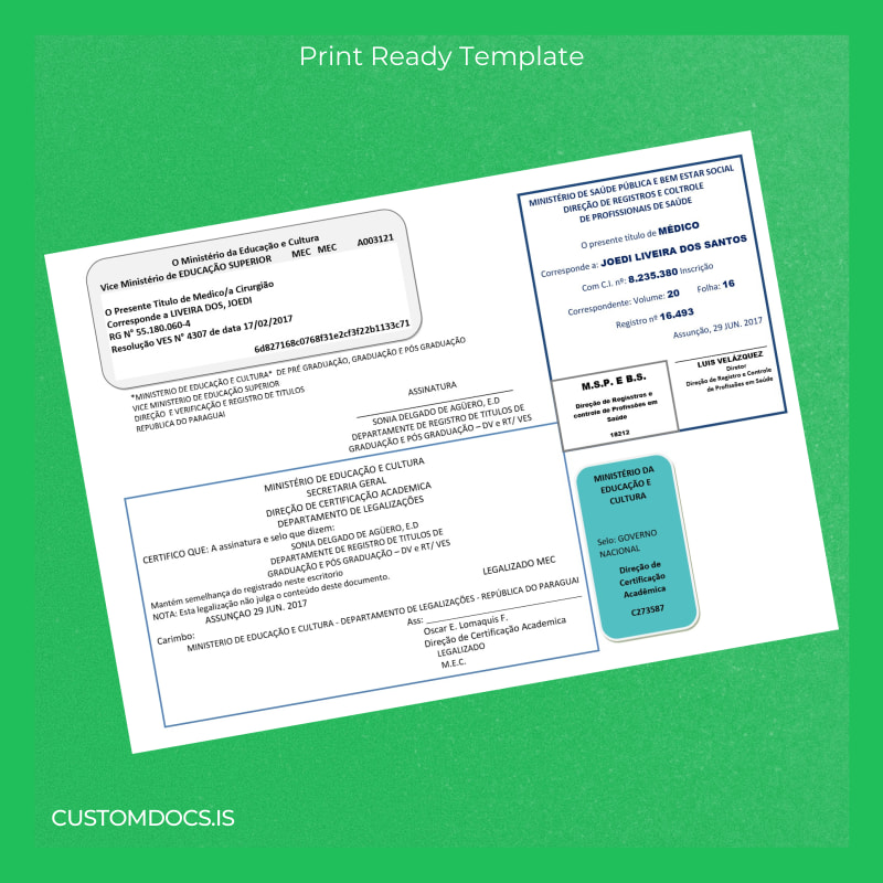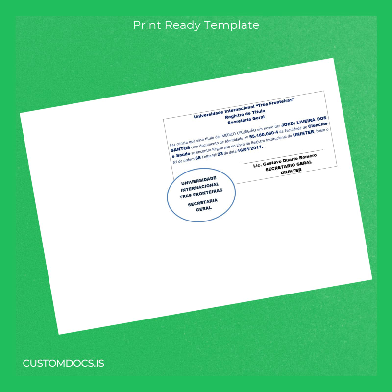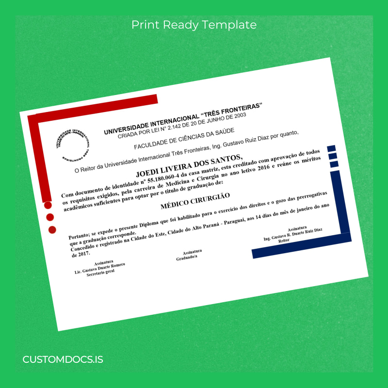 Be the first to review “Download Paraguay Universidade Internacional Três Fronteiras Doctor of Medicine Diploma Template – Word & PDF – Instant Digital File 5 Page”