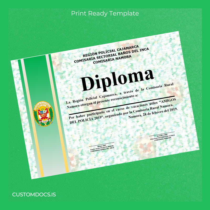 The Customizable Degree Template category includes the Peru Comisaria Rural Namora Diploma of Recognition 2019 Template – Word & PDF, a fully editable and print-ready document crafted for swift, professional diploma replacement or reproduction. This template is ideal for professionals requiring a replacement diploma form that can be quickly personalized and used for official purposes.