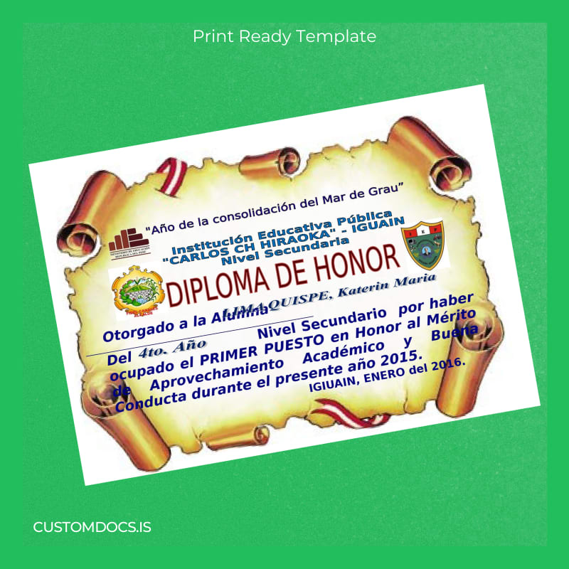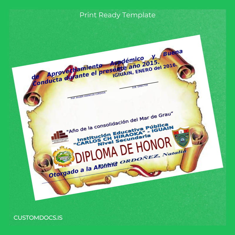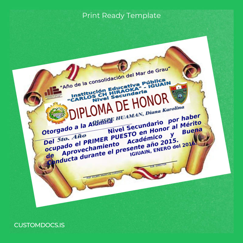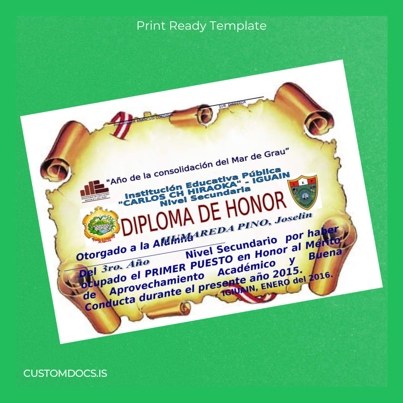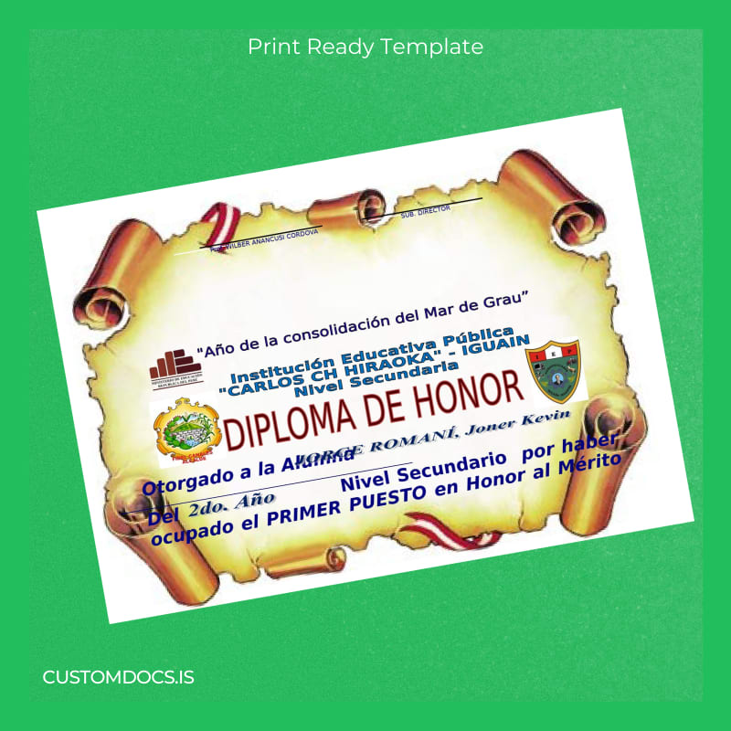 This template addresses the core concerns of educators, administrators, and graduates who need a reliable and straightforward tool to reproduce or replace high school diplomas without delay. By eliminating long administrative queues and delivering editable digital documents, the Peru Educational Institution _Carlos Ch Hiraoka_ High School Diploma Template stands out as an essential resource accessible worldwide.
